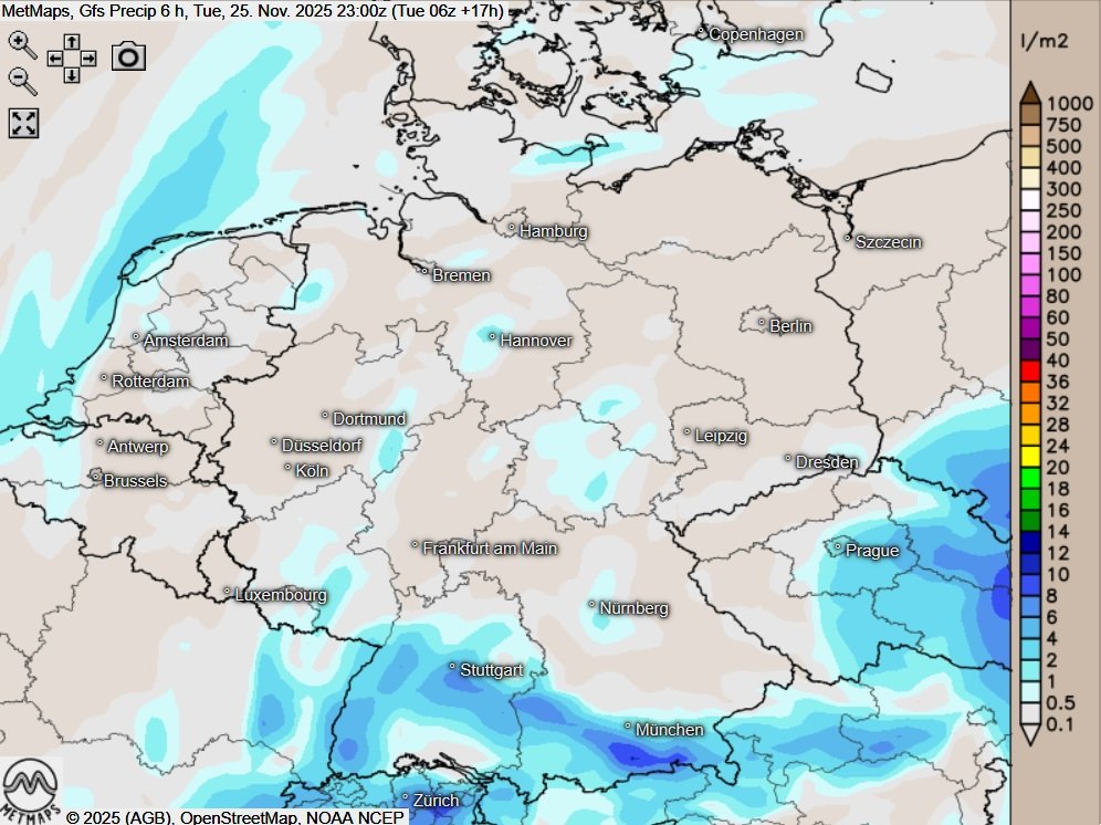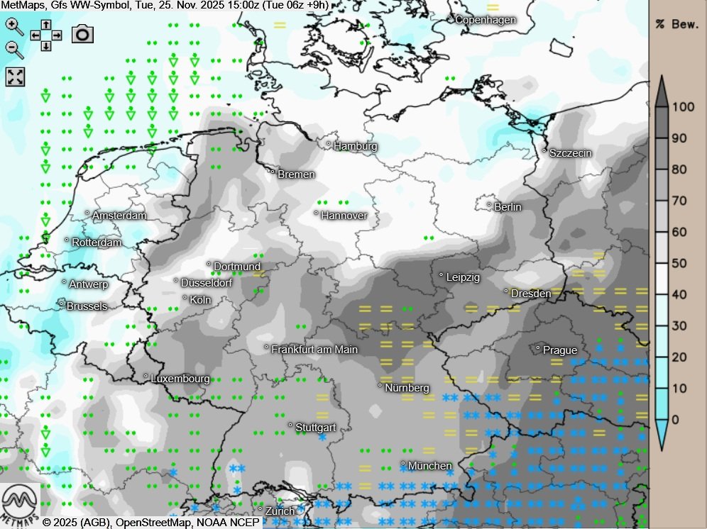 Am Dienstagnachmittag zeigt sich der Himmel verbreitet stark bewölkt oder es ist bedeckt, dabei fällt im Südosten sowie an den Alpen zeitweise Schnee. Im Westen und Südwesten fallen die Niederschläge am Nachmittag als Regen, nur in höheren Lagen auch Schneeregen oder Schnee. Im Norden und Osten bleibt es bis auf einzelne Schauer weitgehend trocken.