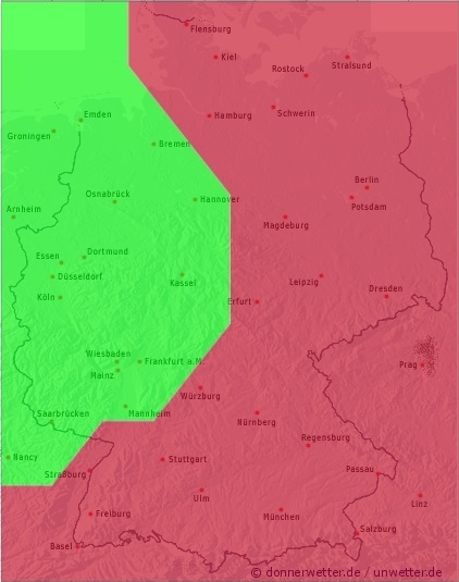 In weiten Teilen Deutschlands ist auch in der zweiten Tageshälfte mit erneuten Unwettern zu rechnen. Zwischen den Küsten und Alpen warnt der Deutsche Wetterdienst vor schweren Gewittern mit Starkregen, Hagel und Sturmböen. Verschont bleibt voraussichtlich nur der Westen zwischen Elbemündung und Saarland, der aber trotzdem mit anhaltenden Regenfällen rechnen muss. Östlich der Luftmassengrenze, die sich zurzeit über Deutschland erstreckt, bilden sich jedoch in feucht-warmer Luft lokal Gewitter, die nur kurzfristig vorherzusagen sind.