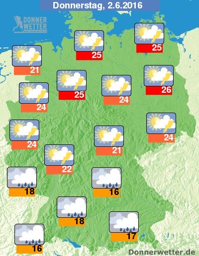Am Donnerstag ist es im Süden verbreitet dichte bewölkt und dazu oft regnerisch. Weiter nach Norden hin wechseln sich Sonne und teils dichte Wolken einander ab und besonders in den Nachmittagsstunden bilden sich gebietsweise Schauer und teils kräftige Gewitter. Die Temperatur steigt auf 16 Grad in Unterfranken und bis 26 Grad in Berlin.