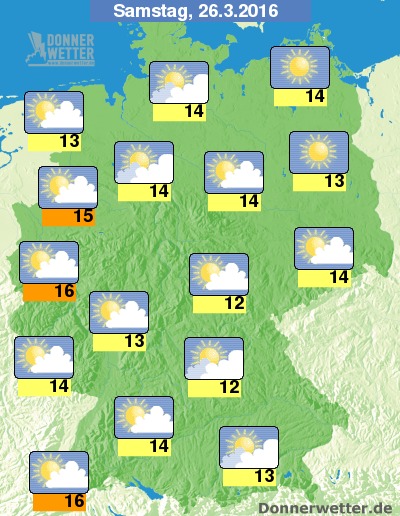 Am Samstag zeigt sich wohl im ganzen Land immer wieder mal die Sonne und vor allem im Nordosten ist es auch über weiten Teilen sonnig, jedoch ziehen in den anderen Regionen auch häufig einige, teils auch dichtere Wolken durch, dabei bleibt es aber trocken. Die Temperatur steigt auf 12 Grad in Oberfranken und bis 16 Grad im Rheinland.