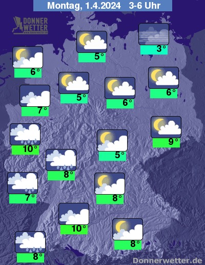 In der Nacht zum Montag breitet sich Regen vom Südwesten her bis über die gesamte Südwesthälfte Deutschlands aus. Im Norden und Osten ist es anfangs noch meist locker, zunehmend jedoch stark oder dicht bewölkt, bis zum Morgen bleibt es hier aber noch trocken. Die Temperatur sinkt auf 10 Grad in Köln und bis 3 Grad in Neubrandenburg.