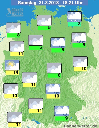 Heute Abend fällt über dem Nordosten, Osten und dem Alpenvorland zeitweise Regen, hier und da auch Schneeregen oder Schnee, sonst ist es zwar stark bewölkt, aber weitgehend trocken. Die Temperatur liegt bei 5 bis 14 Grad.