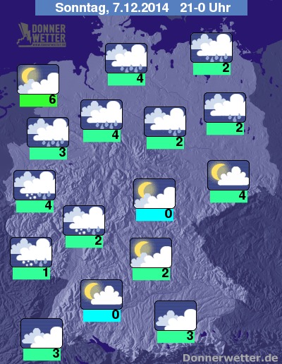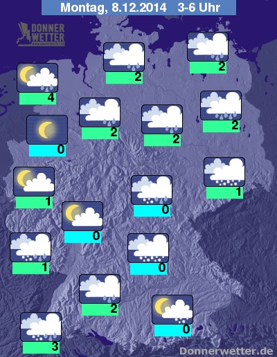 In der Nacht zum Montag breiten sich Regen, Schneeregen und Schnee weiter nach Südosten hin aus, von Nordwesten her klingt der Regen gleichzeitig meist wieder ab und die Bewölkung kann zeitweise aufklaren. In Küstennähe weht weiterhin ein zeitweise starker Wind. Die Temperatur sinkt auf 4 Grad im Emsland und bis 0 Grad am Westerwald.
