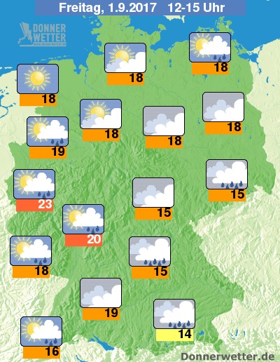 Die Temperaturen erreichen Werte um 14 Grad C am Alpenrand und um 24 Grad C im Rheinland.