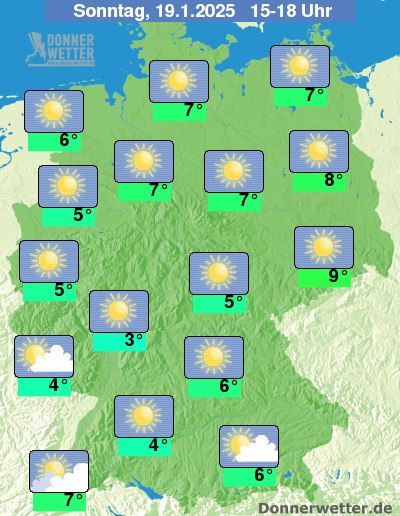Am Sonntagnachmittag ist es meist heiter oder die Sonne scheint von einem wolkenlosen Himmel. In den Niederungen Süd- und Südwestdeutschlands kann sich gebietsweise auch noch Nebel oder Hochnebel halten. Es bleibt trocken.