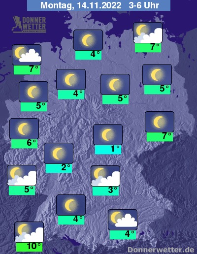 In der Nacht zum Montag ist der Himmel über der Bundesrepublik verbreitet sternenklar. Im Süden, Südwesten und im Ostseeumfeld können auch einige Wolken durchziehen, dazu bleibt es trocken. Stellenweise bildet sich Nebel oder Hochnebel. Die Temperatur sinkt auf 10 Grad im Breisgau und etwa 1 Grad im Vogtland.