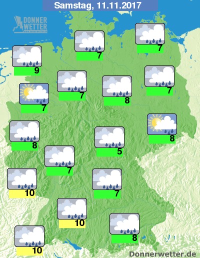 Heute sind über der Nordhälfte des Landes anfangs einzelne Auflockerungen möglich, sonst ziehen jedoch größtenteils dichte Wolken durch und es fällt verbreitet Regen. Die Temperatur erreicht herbstliche 5 bis 10 Grad. An der Ostsee weht noch ein oft starker Wind.
