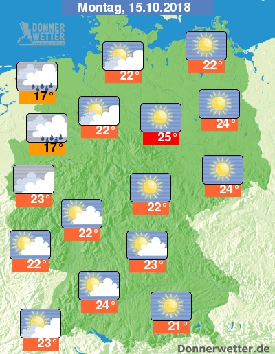 In der Nacht zum Montag ist der Himmel über der Osthälfte weitgehend sternenklar, weiter nach Westen hin nehmen die Wolkenanteile stetig zu und am Niederrhein und der Ems fällt gegen Morgen auch gebietsweise Regen, sonst bleibt es trocken. Die Temperatur sinkt auf 17 Grad in Köln und bis 10 Grad im Berchtesgadener Land.