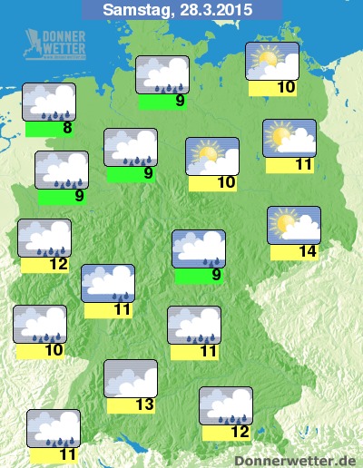 Für das kommende Wochenende scheint uns das sehr wechselhafte und oft nasskalte Wetter treu zu bleiben. Sowohl am Samstag als auch am Sonntag ziehen voraussichtlich meist viele und oft auch dichte Wolken durch, die für zeitweilige Regenfälle sorgen dürften. Die Temperaturen liegen am Samstag zwischen 8 und 14, am Sonntag bei unwesentlich milderen 9 bis 15 Grad.