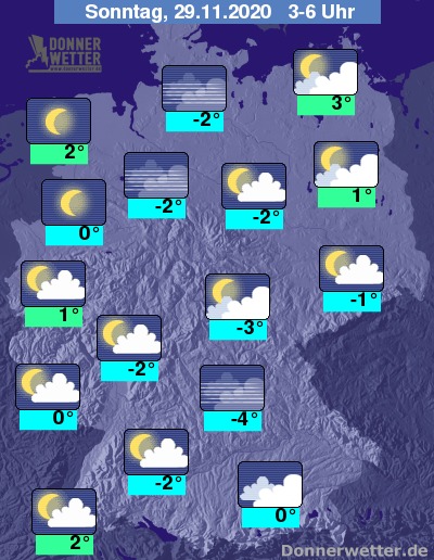 In der kommenden Nacht ist es überwiegend sternenklar, teils auch locker bewölkt. Stellenweise bildet sich Nebel. Es bleibt landesweit trocken bei Tiefstwerten von 2 Grad am Oberrhein und bis -4 Grad in Mittelfranken.