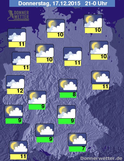 In der Nacht zum Freitag ist es im Norden und Westen meist dicht bewölkt, aber zunächst trocken, weiter nach Süden und Osten zeigt sich der Himmel oft noch locker oder aufgelockert bewölkt. In der zweiten Nachthälfte ziehen dichte Regenwolken in den Norden und Westen von Deutschland. Bis zum Morgen regnet es auch in weiten Teilen des Ostens und bis etwa nördlich des Mains, im südlichen Baden-Württemberg und im südlichen Bayern bleibt es teils aufgelockert bewölkt und dazu weitgehend trocken. Die Temperatur sinkt auf 11 Grad in Aachen und bis 6 Grad in Augsburg.