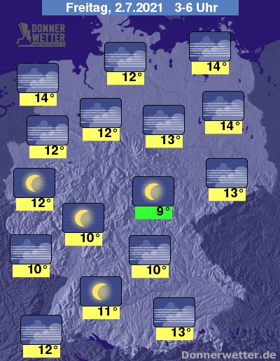 In der Nacht zum Freitag ist es häufig dunstig-trüb oder stärker bewölkt, vor allem über der Südhälfte zeigt sich der Himmel zum Großteil auch sternenklar. Es bleibt weitgehend trocken bei Tiefstwerten von 14 Grad im nördlichen Emsland und bis 9 Grad im Grabfeld.