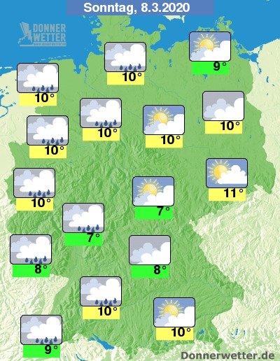 Am Sonntag ist es im Osten und Südosten oft locker bis aufgelockert, im übrigen Bundesgebiet jedoch meist stark bewölkt, dabei ist es zunächst trocken. Im weiteren Verlauf ziehen jedoch von Westen dichte Wolken mit Regen auf, der sich bis zum Abend etwa bis auf die Westhälfte des Landes ausbreitet. Die Temperatur erreicht recht einheitliche 7 bis 10 Grad.