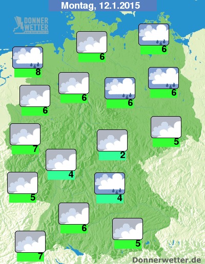Heute bleibt die Wolkendecke weitestgehend verschlossen und nur sehr selten kann sich die Sonne mal zeigen. Besonders im Norden, aber auch in der Mitte fällt dabei zeitweise etwas Regen, im Süden bleibt es dagegen überwiegend trocken. Die Temperatur steigt auf 2 Grad im Vogtland und bis auf 8 Grad in Ostfriesland. Dazu weht verbreitet starker Wind mit stürmischen Böen, vereinzelt sind Sturmböen möglich. An der Küste und auf den Bergen herrscht zum Teil Sturm, dabei sind orkanartige Böen möglich.