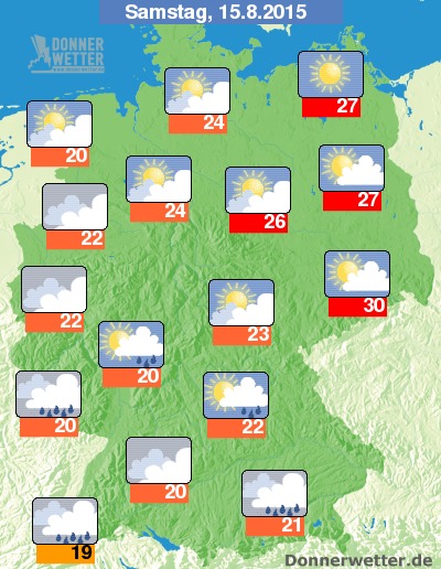 Am Samstag zieht besonders über den Süden von Deutschland, aber auch über die übrigen Landesteile meist starke Bewölkung durch, dabei fällt in der Südhälfte zeitweise Regen. Im Norden, vor allem im Nordosten ist es jedoch auch teils heiter bis sonnig und hier bleibt es auch weitgehend trocken. Die Temperatur steigt auf kühle 19 Grad im Breisgau und bis 30 Grad in Dresden.
