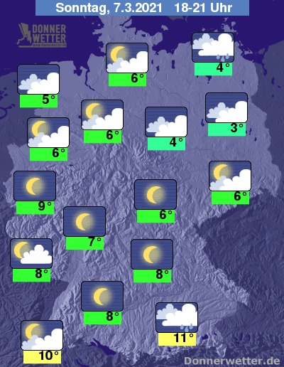 Die Temperaturen gehen am späteren Abend auf Werte um 5 Grad am Hochrhein und 0 Grad im Thüringer Becken zurück.