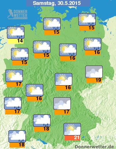 Heute ist es verbreitet wechselnd bewölkt, insbesonders über der Nordhälfte und im Alpenvorland aber auch häufig stark bewölkt, hier bilden sich schwerpunktmäßig auch zeitweilige Schauer und auch vereinzelte Gewitter, im übrigen Land bleibt es zumeist trocken. Die Temperatur steigt auf kühle 14 Grad an der Nordseeküste und bis 21 Grad in München.