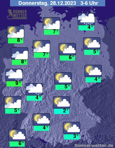 Am Donnerstag zieht oft aufgelockerte, zeitweise jedoch starke Bewölkung durch, dabei fällt nur vereinzelt etwas Regen oder es bilden sich kurze Schauer. Die Temperatur steigt auf 7 Grad in Mittelfranken und bis 11 Grad in der Kölner Bucht. Im Norden und Nordwesten weht ein frischer und oft auch starker Wind. An den Küsten ist es verbreitet stürmisch und es können schwere Sturmböen auftreten.
