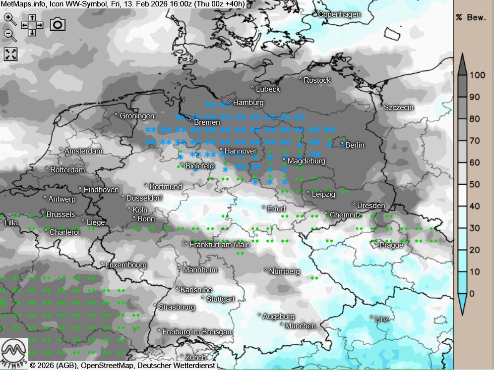 Am Freitagnachmittag ist der Himmel über dem äußersten Süden und Südosten wechselnd bewölkt, an den Alpen kann sich die Sonne auch längere Zeit zeigen. Dabei bleibt es weitgehend niederschlagsfrei. In den übrigen Landesteilen ist es verbreitet stark bewölkt oder bedeckt, dabei fällt zeit- und gebietsweise teils schauerartig verstärkter Regen, im Norden, Osten und Nordosten auch Schnee mit Glättegefahr.