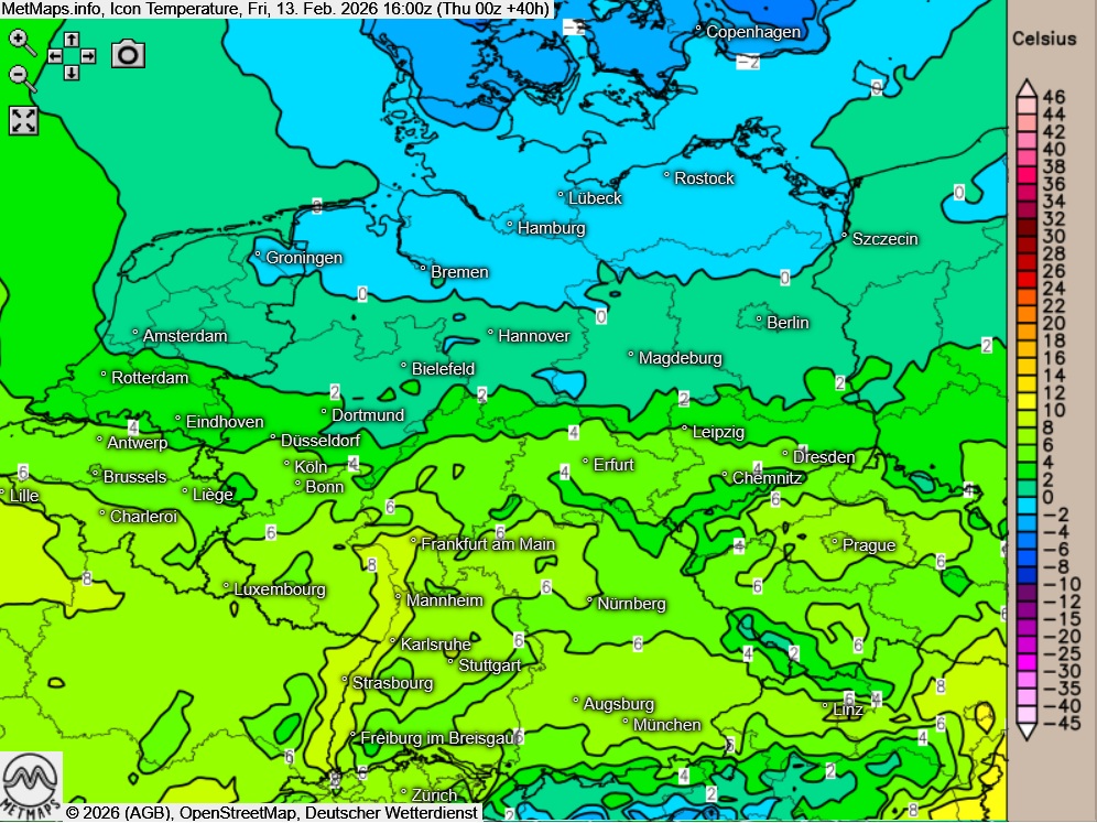 Innerhalb Deutschlands 10 Grad Temperaturdifferenz am Nachmittag.