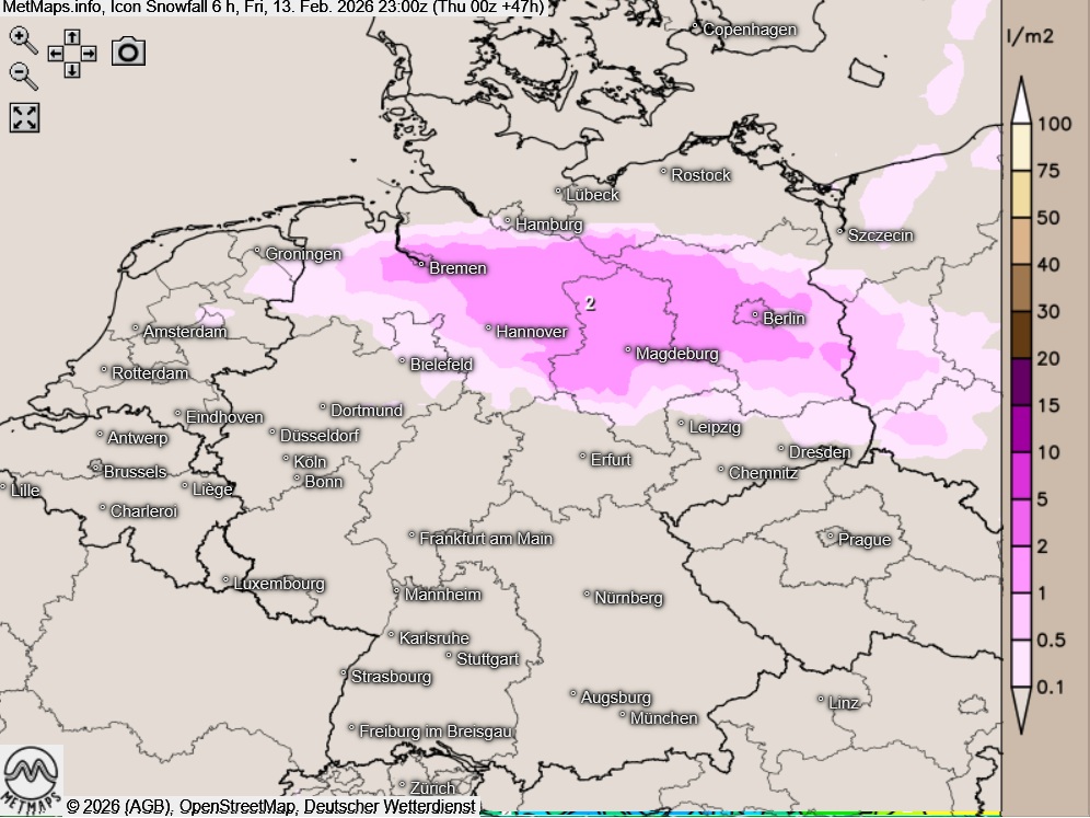 Die Wetter- und Temperaturkarte für Freitagnachmittag (16:00 Uhr) sowie die Sechs-Stunden-Schneemengen bis 23:00 Uhr nach ICON: