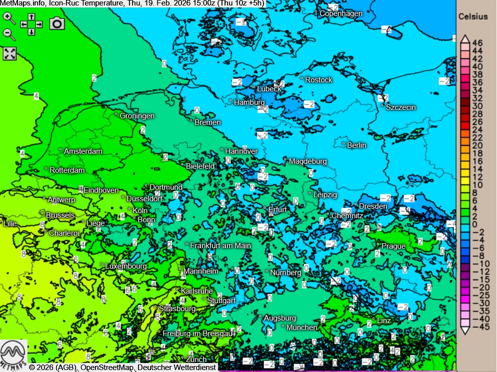 Die Temperatur- und Wetterkarte für 15:00 Uhr sowie die Sechs-Stunden-Schneemengen bis 21:00 Uhr nach ICON-RUC: