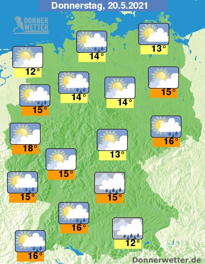 Am Donnerstag zeigt sich das Wetter im Süden und über Sachsen meist stark bewölkt, dabei bilden sich zeitweise Schauer, regional auch Gewitter. Im übrigen Bundesgebiet ist es teils heiter, zum Teil stark bewölkt, dazu bilden sich nur noch vereinzelt Schauer. Die Temperatur erreicht 12 Grad in Wilhelmshaven und bis 18 Grad in der Kölner Bucht.