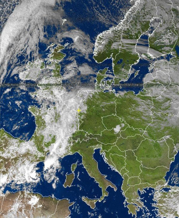 Auf dem Satellitenbild über Westeuropa sind dichte Regenwolken zu sehen. Weite Teile Deutschlands sind wolkenfrei. Mehr Satellitenbilder sind hier zu finden.