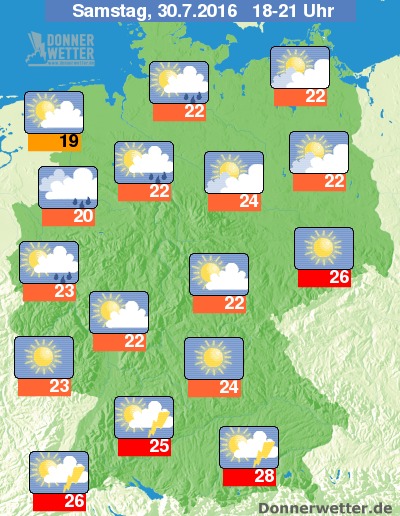 Heute Abend ist es vom Saarland und Rheinland-Pfalz in einem breiten Streifen bis nach Ostdeutschland verbreitet heiter oder sonnig und trocken. Im Alpenvorland ist es dagegen wechselnd oder stark bewölkt und es bilden sich hier und da Schauer oder auch Gewitter. In den übrigen Landesteilen ist es teils locker oder aufgelockert, teils jedoch stark bewölkt, dazu bilden sich mögliche Schauer. Die Temperatur liegt bei 19 Grad an der Wesermündung und etwa 28 Grad in München.