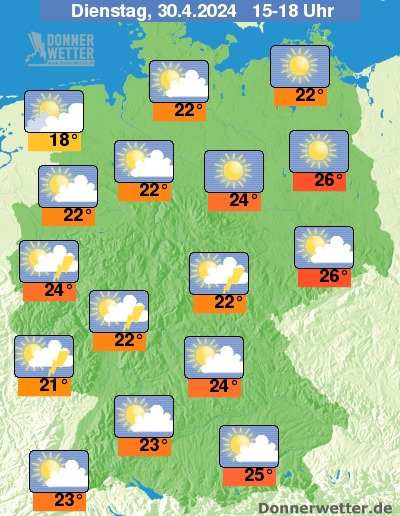In den Nachmittagsstunden zeigt sich der Himmel über der West- und Nordwesthälfte meist wolkig, dabei können lokale Schauer und Gewitter nicht ausgeschlossen werden. Im Süden und Osten ist es heiter oder sonnig, teils kann der Himmel aber durch Saharastaub getrübt sein.