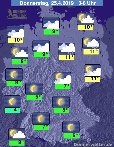 In der kommenden Nacht gibt es im Süden und Westen Aufklarungen. Der Norden und Osten hingegen bringt teils aufgelockerte oder eine geschlossene Wolkendeckt mit sich. Schauer sind um Brandenburg und der Altmark zu erwarten. Die Temperaturen fallen auf 4 Grad im Saarland und 11 Grad um Berlin.