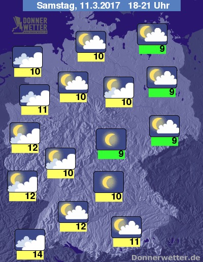 Heute Abend ist der Himmel vom Norden Bayerns bis nach Thüringen meist sternenklar, ansonsten ist es größtenteils locker bis aufgelockert bewölkt. Oft auch dichte Wolken halten sich im Nordwesten sowie im Südwesten der Republik. Es bleibt überall trocken bei Abendwerten zwischen 9 und 14 Grad.