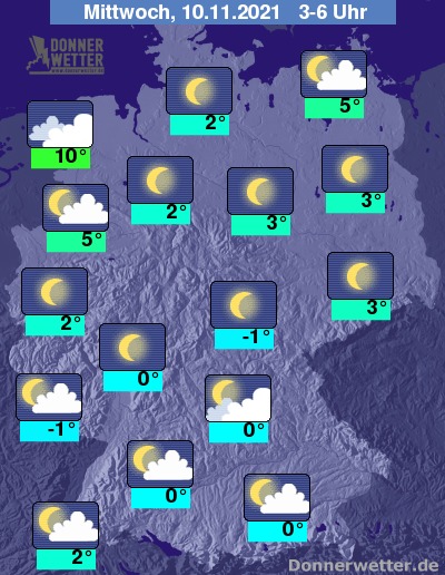 In der folgenden Nacht bleibt es im Nordseeumfeld weitgehend wolkenverhangen, auch im übrigen Nordwesten, an der Ostsee und südlich des Mains zeigen sich einige, meist jedoch lockere Wolken. Im übrigen Land ist der Himmel größtenteils sternenklar. Es bleibt trocken bei Tiefstwerten von 10 Grad direkt an der Nordsee und bis -1 Grad im Grabfeld.