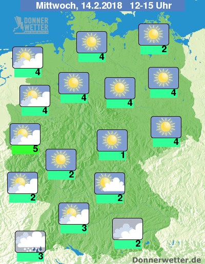 Heute Nachmittag halten sich im äußeren Süden und Südwesten dichte Wolken, die hier gebietsweise Regen, Schneeregen oder Schnee bringen, auch im übrigen Süden und Westen ist es zum Teil stark, teils auch locker bewölkt, dazu bleibt es weitgehend trocken. Verbreitet sonnig zeigt sich die Nordosthälfte Deutschlands, dabei bleibt es natürlich trocken. Die Temperatur liegt bei 1 Grad im Grabfeld und etwa 5 Grad in der Kölner Bucht.