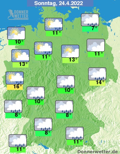 Heute ist es über dem Süden bedeckt und regnerisch, sonst ist es größtenteils stark, regional auch aufgelockert bewölkt, dabei bilden sich gebietsweise einzelne Schauer. Die Temperatur steigt auf 7 Grad auf Rügen und bis 16 Grad im Rheinland.