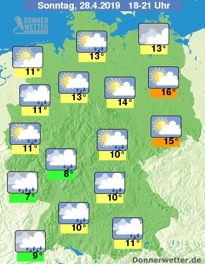 Heute Abend bleibt es über der Nordosthälfte bei teils heiterem, teils bewölktem Himmel größtenteils trocken. Im Süden und Westen ist der Himmel hingegen weitgehend bedeckt und es bilden sich vielerorts Schauer. Die Temperatur liegt bei nur 7 Grad am Pfälzer Wald und bis 16 Grad in Berlin.