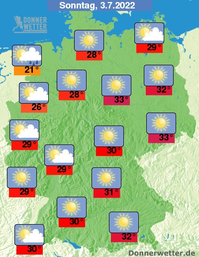 Heute ist es überwiegend heiter bis sonnig, gebietsweise ziehen auch ein paar Wolken durch. Im Nordwesten bilden sich vereinzelt auch Schauer oder Gewitter, während es im übrigen Land weitgehend trocken bleibt. Die Temperatur erreicht 21 Grad an der Nordsee und bis 33 Grad in der Lausitz.