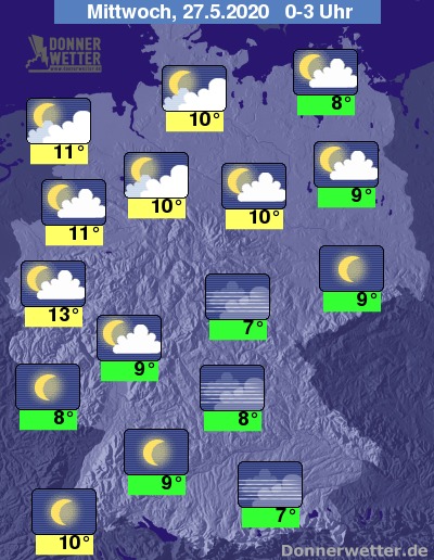 Bis zu den Frühstunden kühlt die Luft auf 12 bis 6 Grad ab, am mildesten bleibt es von der Ems bis ins Ruhrgebiet, am kühlsten wird es in Bayern.