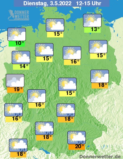 Heute Nachmittag zeigt sich das Wetter im Süden teilweise heiter, teils ziehen hier jedoch dichte Wolken durch, dabei bilden sich einzelne Schauer, lokal sind auch Gewitter möglich. Im übrigen Land ist es größtenteils heiter, teils aber auch stark bewölkt, dabei bleibt es weitgehend trocken. Die Temperatur liegt bei 10 Grad an der Nordsee und bis 20 Grad in München.