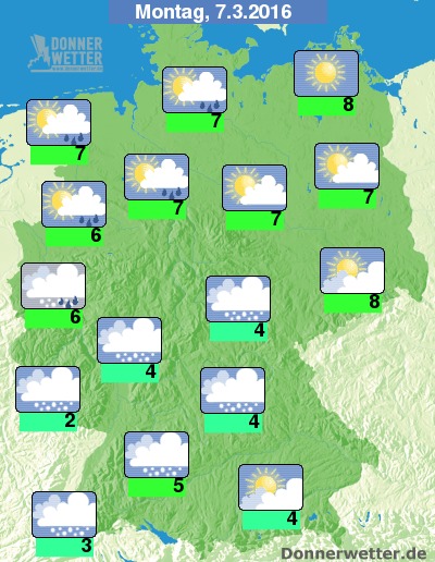 Heute ist es im Norden oft heiter und mehrheitlich auch trocken, im Nordwesten ziehen jedoch im Tagesverlauf auch einzelne Schauer durch, im übrigen Bundesgebiet ist es zumeist stark, teils aber auch aufgelockert bewölkt, dabei fällt gebietsweise Schnee, Schneeregen oder Regen. Es besteht stellenweise Glättegefahr! Die Temperatur steigt auf 2 Grad am Pfälzer Wald und bis 8 Grad in Dresden.