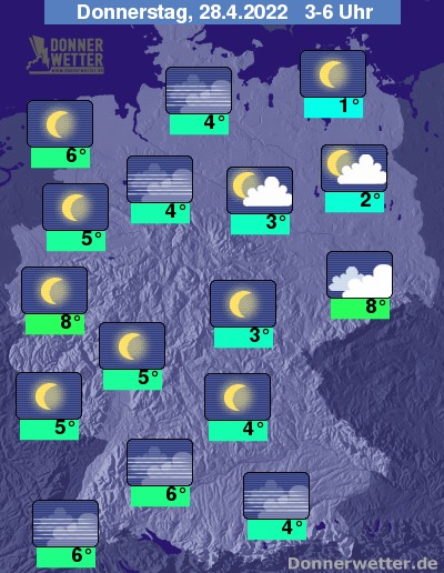 In der Nacht zum Donnerstag zeigt sich der Himmel über Deutschland verbreitet sternenklar. Im Osten und speziell über Sachsen können sich auch einige und teils dichte Wolken halten, dazu bleibt es trocken. Die Temperatur sinkt auf 8 Grad in Dresden und etwa 1 Grad in Neubrandenburg.