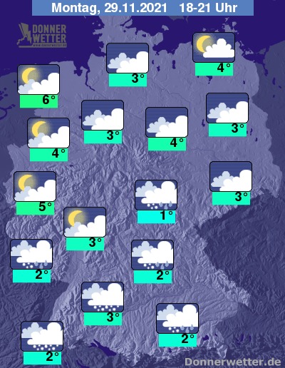 Heute Abend zeigen sich vom Rheinland bis zur Nordsee und auch an der Ostsee einzelne Auflockerungen, sonst bleibt es aber weitgehend stark bewölkt oder neblig-trüb. Im Süden fällt verbreitet Schnee oder Schneeregen, sonst bleibt es meist trocken. Die Temperatur liegt bei 1 Grad in Erfurt und bis 6 Grad in Wilhelmshaven.