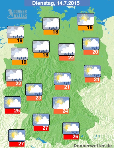 Am Dienstag scheint vor allem nach Südwesten hin häufig die Sonne und es bleibt hier weitgehend trocken. Auch im Ostseeumfeld kann sich neben einigen Wolken häufiger die Sonne zeigen und es bleibt ebenso weitgehend trocken. Im übrigen Bundesgebiet herrscht dagegen meist starke Bewölkung mit zeitweiligen Regenfällen. Die Temperatur steigt auf 18 Grad an der Nordsee und bis 27 Grad in Freiburg.