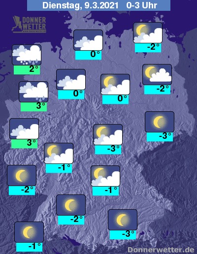 Im Nachtverlauf verdichten sich die Wolken auch über dem Osten und der Mitte Deutschlands weiter. Südlich des Mains dominiert lockere oder aufgelockerte Bewölkung das Himmelsbild, am Alpenrand kann sich Nebel bilden. Bis auf gebietsweise Regen- oder Schneeregenschauer im Nordwesten bleibt es aber meist trocken.