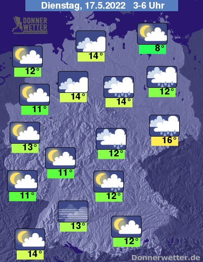In der folgenden Nacht halten sich über der Nordosthälfte Deutschlands weitgehend kompakte Wolken und es bilden sich vielerorts Schauer. Weiter nach Südwesten hin zeigt sich der Himmel dagegen größtenteils locker bewölkt oder sternenklar, hier bleibt es trocken. Die Temperatur sinkt auf 16 Grad in Dresden und bis 8 Grad in Neubrandenburg.
