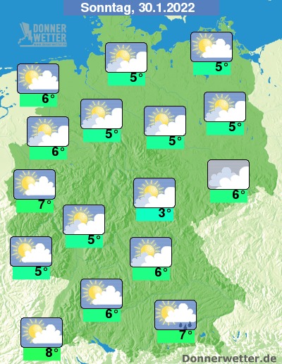 Heute ziehen gebietsweise dichte Wolken durch, vielerorts zeigen sich aber auch Aufheiterungen, zudem bleibt es trocken. Lediglich am Alpenrand sind am Morgen noch letzte Tropfen oder Flocken möglich. Die Temperatur steigt auf 3 Grad im Eichsfeld und bis 8 Grad im Breisgau. Im Norden und Osten ist es verbreitet stürmisch, an den Küsten herrscht ein zum Teil schwerer Sturm mit orkanartigen Böen.
