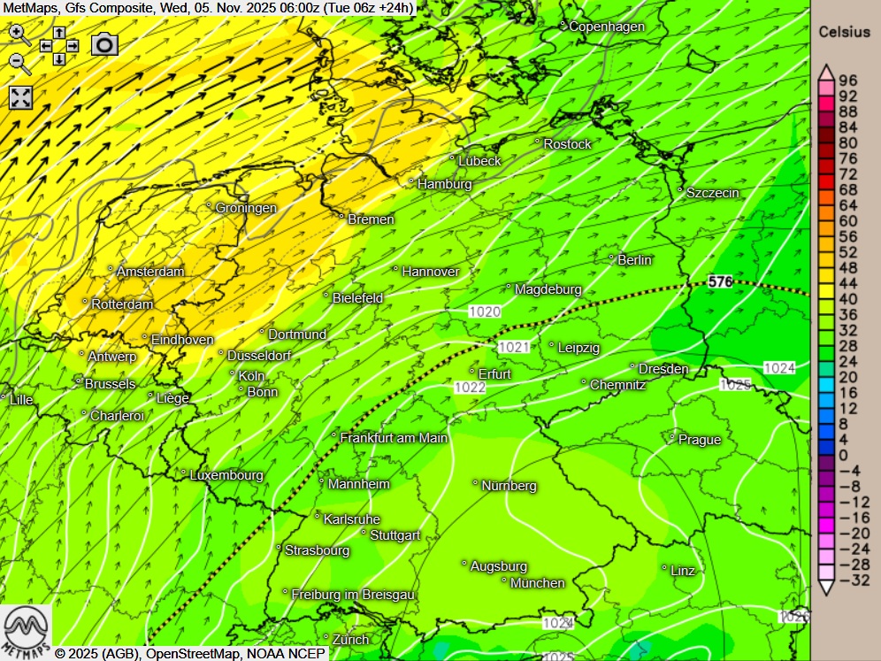 Die Strömungs- und Wetterkarte für Mittwochfrüh (06:00 Uhr) nach GFS: