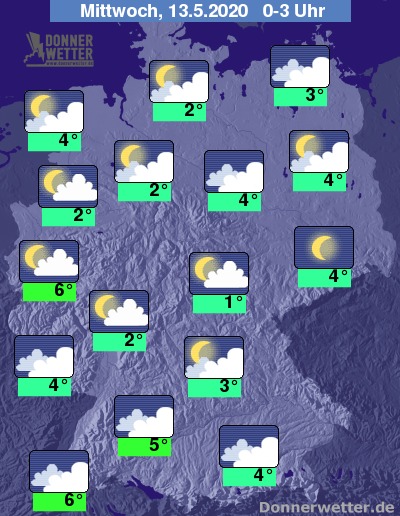 In den Stunden nach Mitternacht zeigt sich der Himmel überwiegend locker oder aufgelockert bewölkt, im Nordosten sowie entlang der Donau ist es auch bedeckt. Schauer sind nicht zu erwarten.