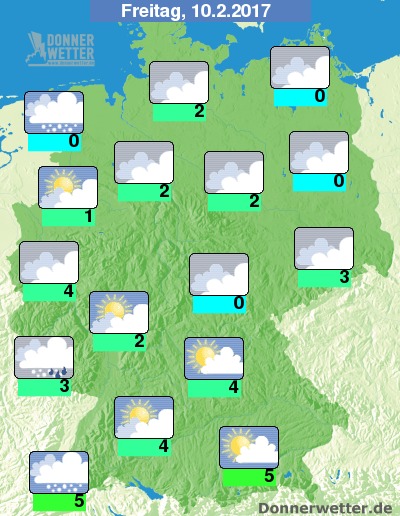 Dabei ist es etwas milder als noch an den vorangegangenen Tagen. Im Norden und Osten liegen die Höchsttemperaturen bei Werten um den Gefrierpunkt, im Süden sind sogar bis +5 Grad in der Spitze möglich.