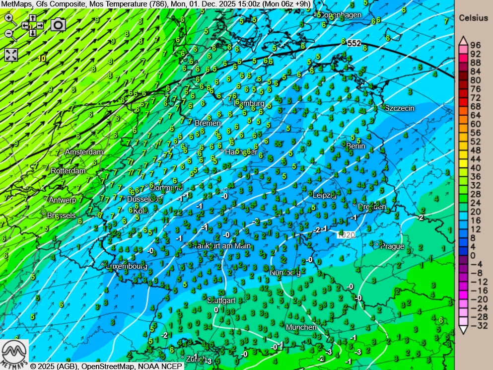Die Strömungs- / Temperaturkarte sowie die Wetterkarte für Montagnachmittag (15:00 Uhr) nach GFS: